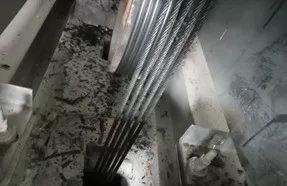 定架间内堆放有废旧的电梯更换物件,曳引机下方的观察孔附近和曳引机固定架上有大量的