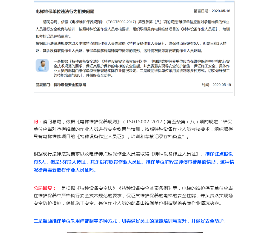 总局回复:师傅带无证学徒维保电梯,违法吗?