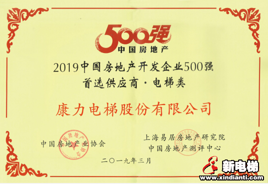 3月20日,2019中国房地产500强测评成果发布会暨500强峰会在北京盛大召开,作为建筑部品领域“奥斯卡”奖项,备受关注的《2019中国房地产开发企业500强首选供应商服务商品牌测评研究报告》正式揭晓。康力电梯凭借卓越的工程业绩和综合能力荣获“2019中国房地产开发企业500强首选电梯类供应商”。