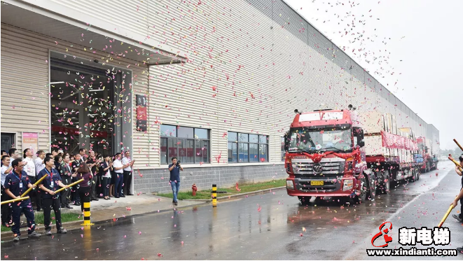 装载着电梯部件的卡车,披红挂彩,正等待着启程,将虏克电梯送往它们的新家园。