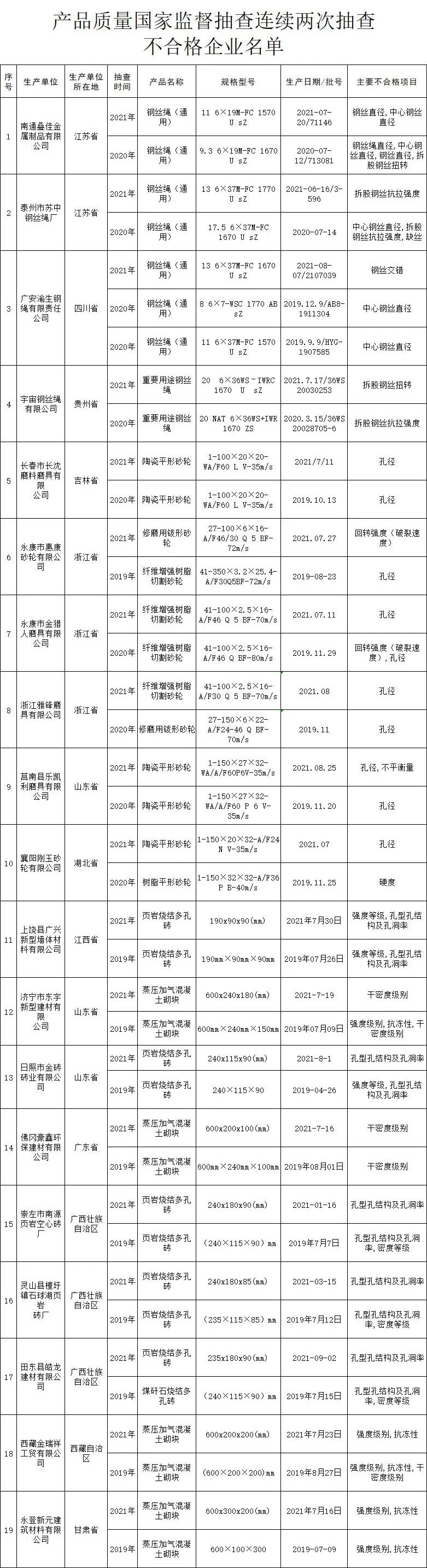 21日,国家市场监督管理总局通报2021年钢丝绳、砂轮和新型墙体材料(砖和砌块)产品质量
