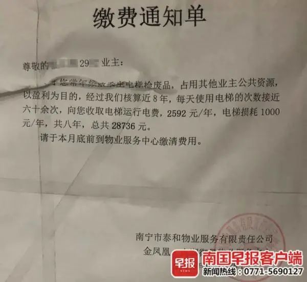 近日,广西南宁一则特别的物业缴费通知单引发热议,一业主近8年频繁乘坐电梯捡垃圾,被
