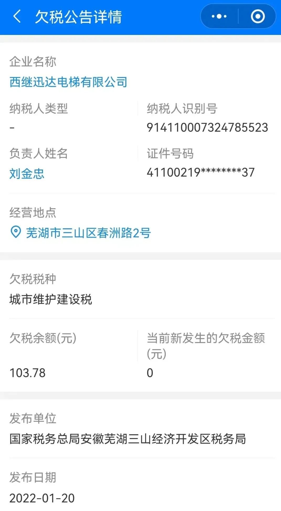 西继迅达电梯22年因欠税被税务机关多次公告追缴