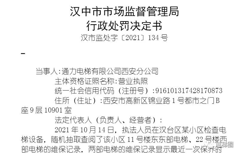 通力电梯有限公司西安分公司因未严格按照安全技术规范进行电梯维护保养,被汉中市市场监督管理局罚款1万元、没收