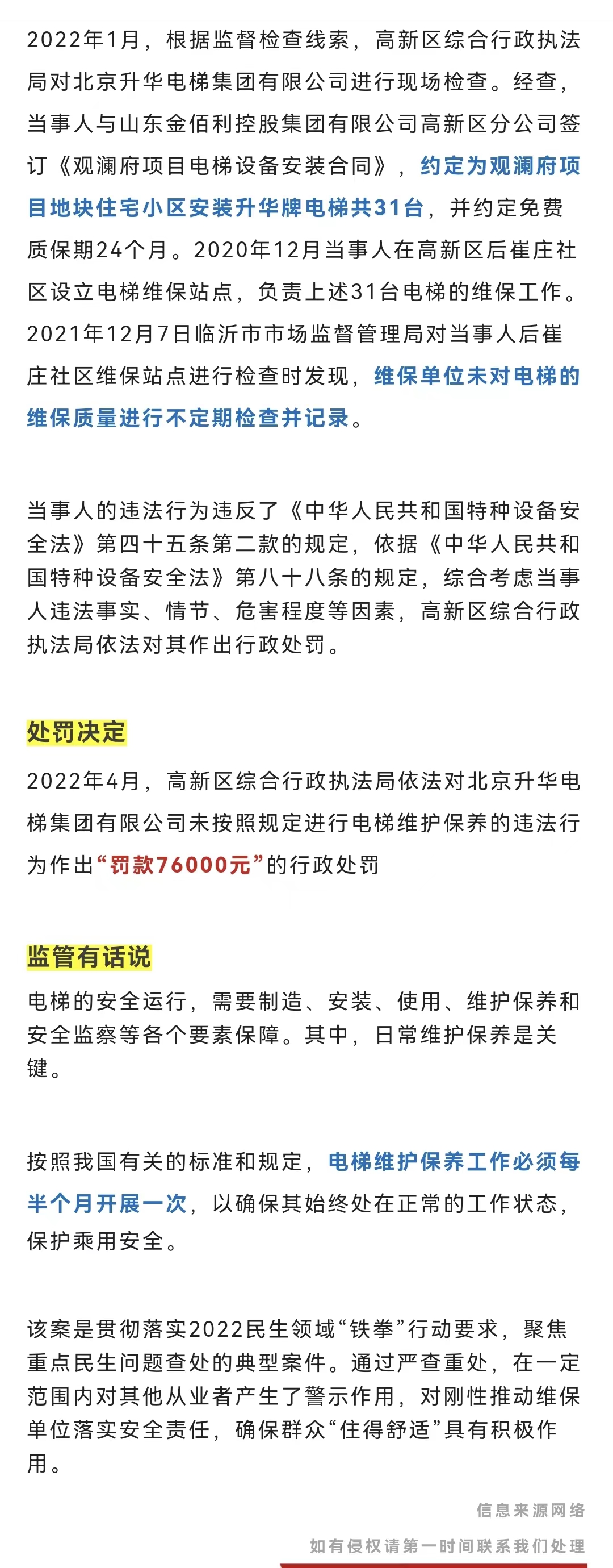 临沂一小区的电梯维保单位被罚7.6万元!