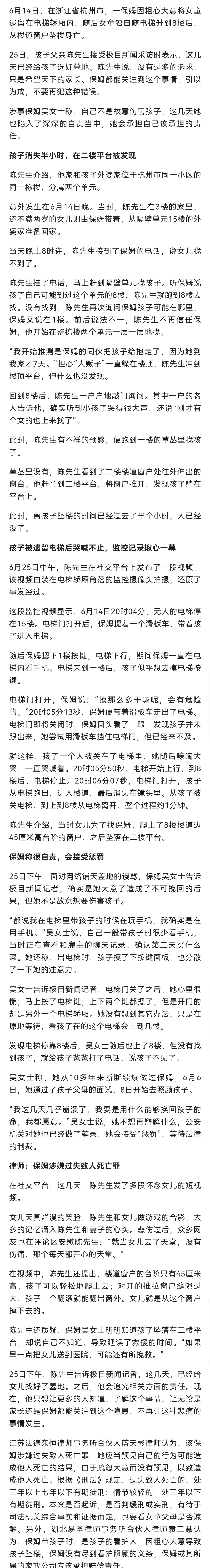 杭州2岁多女童被保姆遗留电梯后从8楼窗户坠亡