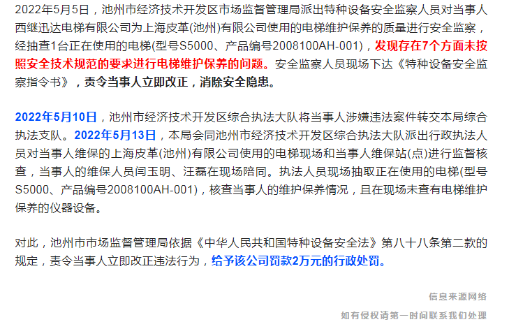 抽检不合格! 西继迅达电梯有限公司被处罚2万