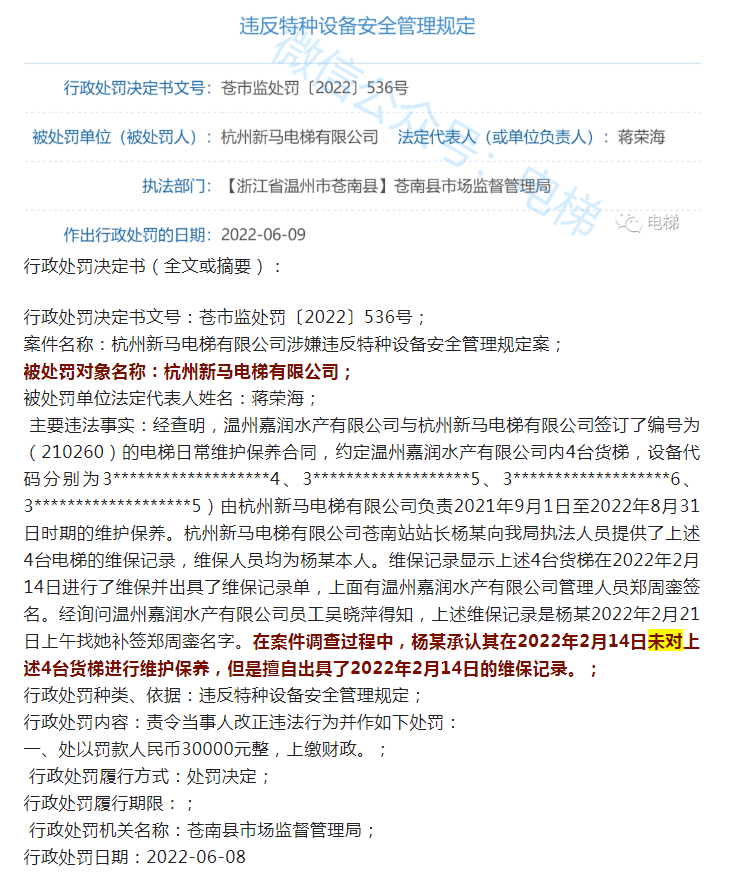 虚假维保,杭州新马电梯被罚3万元!