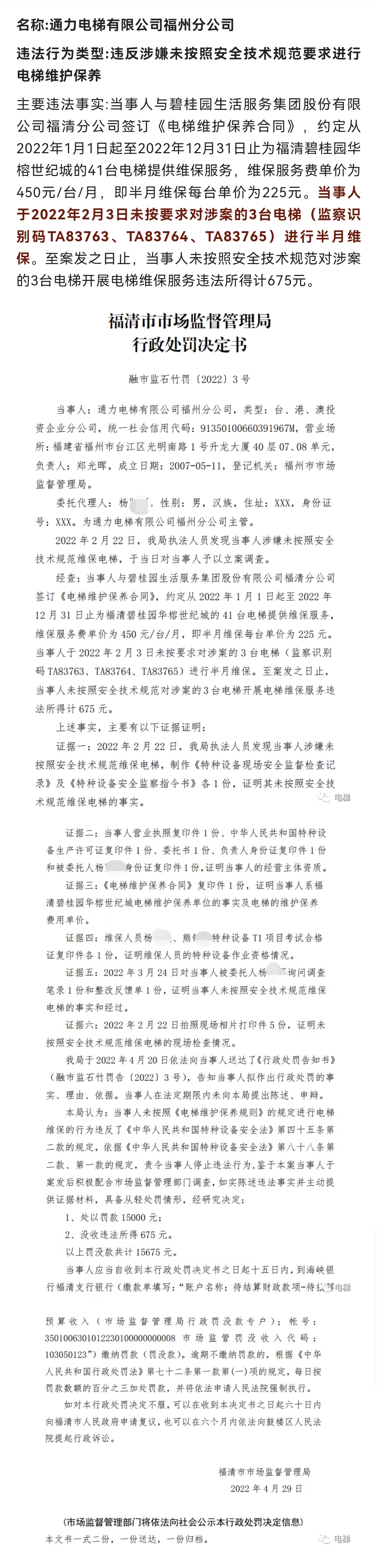 对碧桂园电梯违规保养,通力电梯福州分公司被