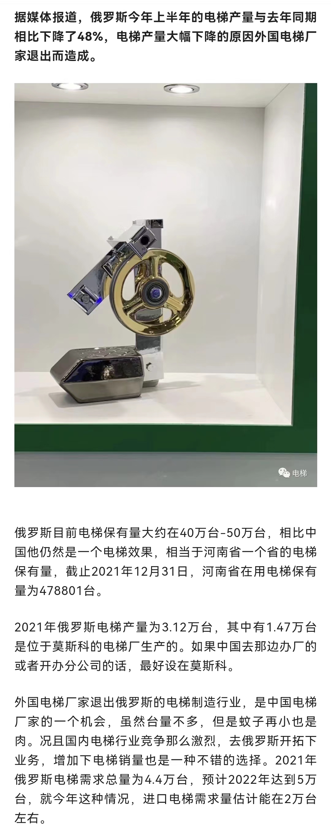 俄罗斯电梯产量因外国电梯厂家退出下降48%