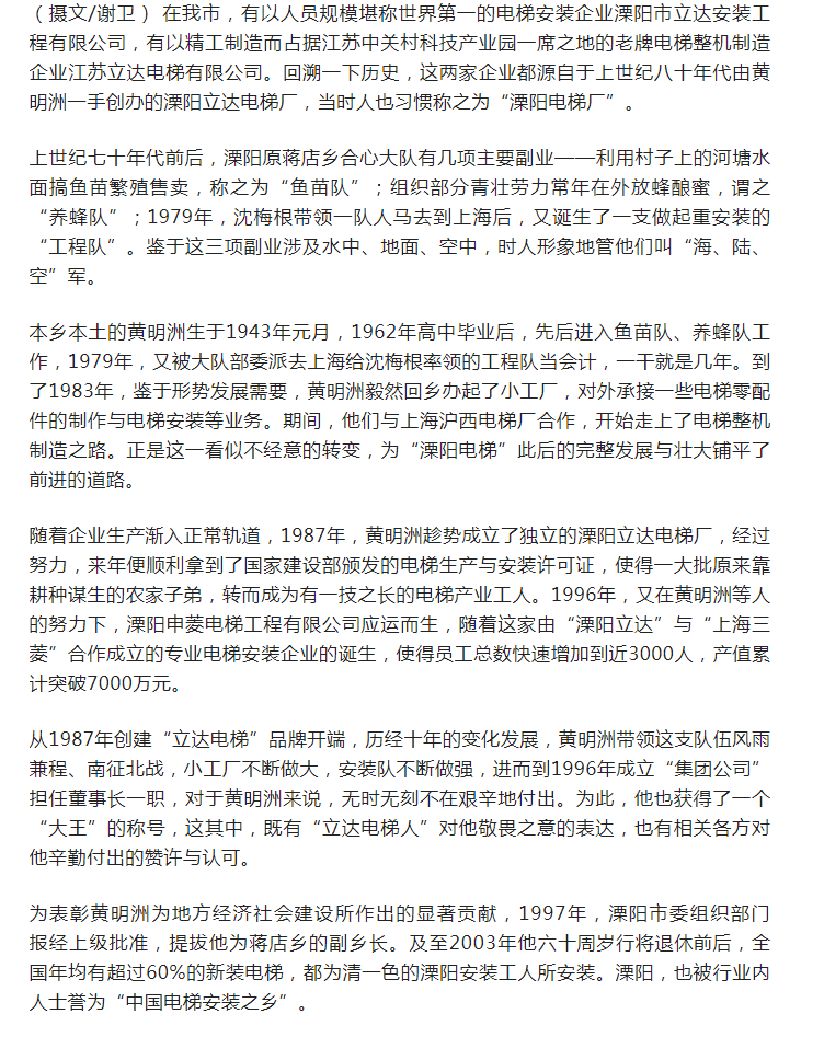 溧阳传奇电梯人:“立达”创始人 黄明洲