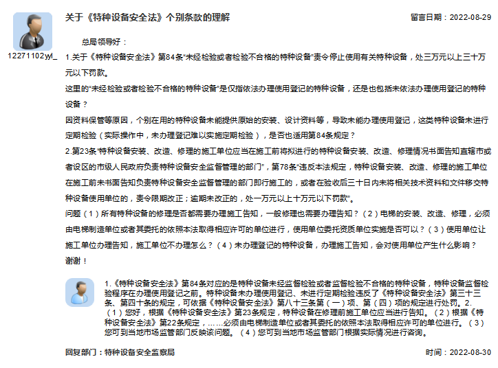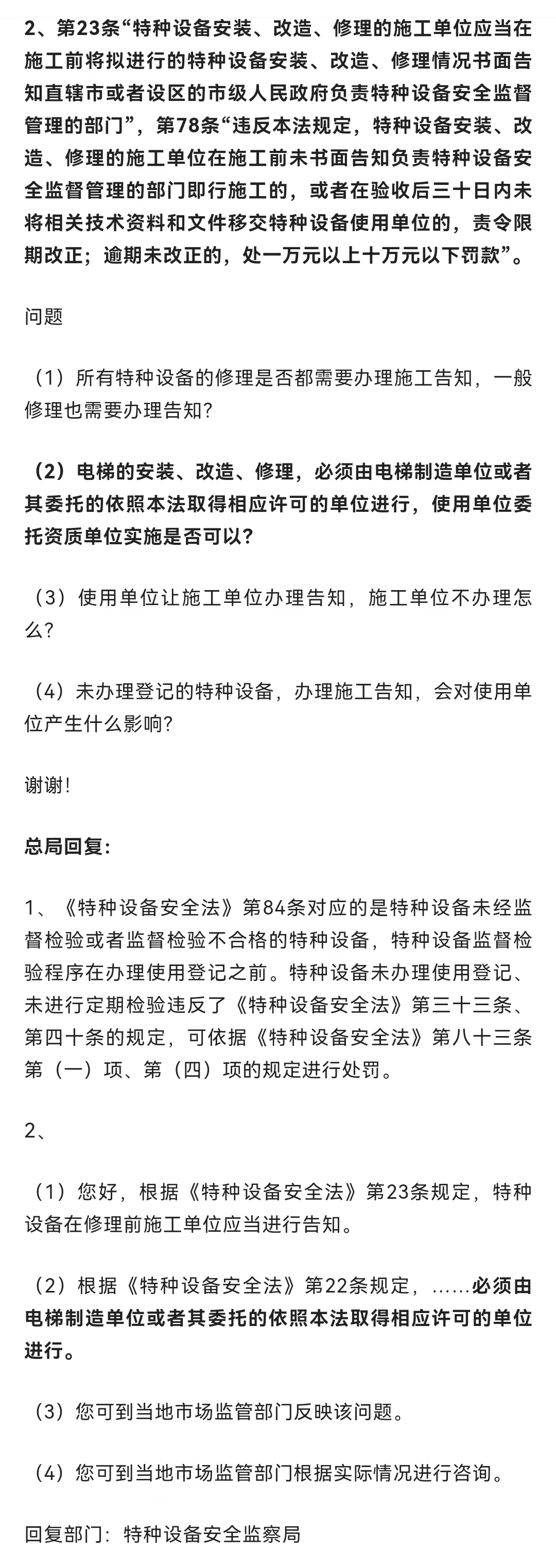 总局回复:关系电梯的安装、改造、修理